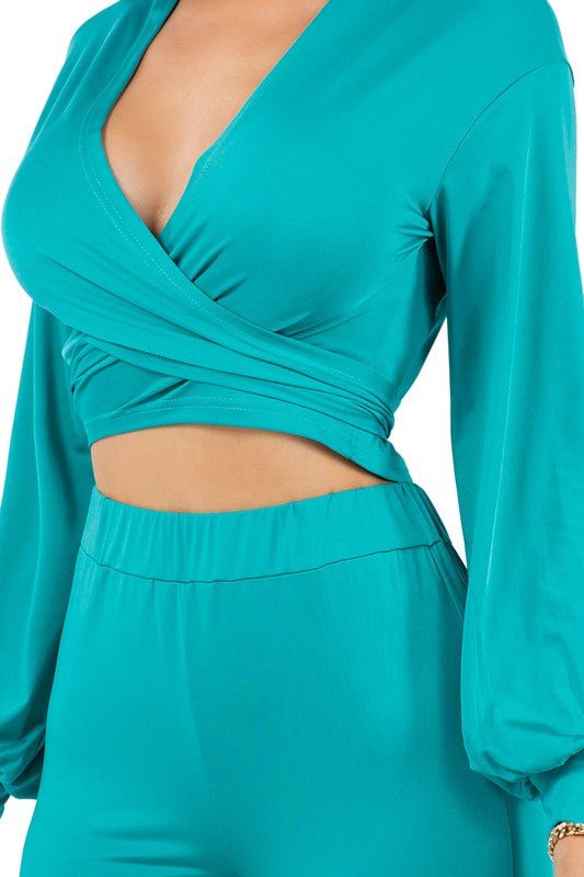 Set the tone with confidence in the Jazmine Pants Set, where sultry meets sophistication. This sexy two-piece ensemble combines a chic long-sleeve wrap-style top with a plunging V-neckline and high-waisted elasticized pants that effortlessly hug your curves. Whether for a night out or a statement daytime look, this set is designed to bring out your bold side.