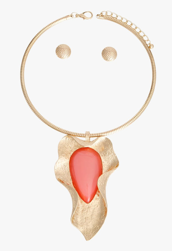 Soft doesn’t mean silent. The Bonded Light Pink Pendant Necklace Set delivers sculptural glow with attitude—featuring a ribbed gold-tone collar and curved leaf-shaped pendant carved with texture and purpose. At the heart: a rose-pink resin teardrop that lights up your neckline like quiet fire. Paired with matching hammered gold button studs, this set brings softness with edge and shimmer with structure.